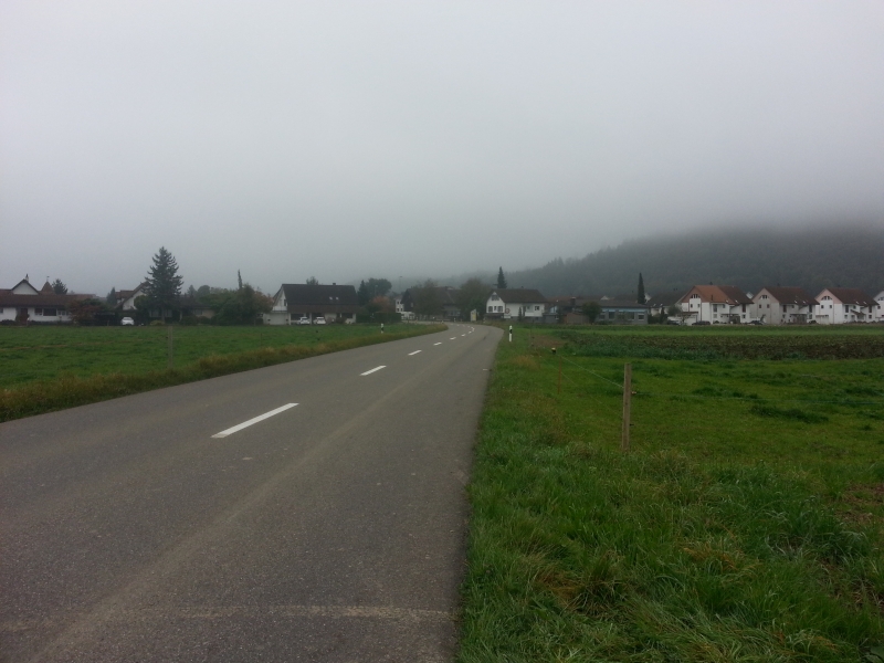 So kam es, dass ich meinen Renner schon vor neun Uhr auf die Strasse stellte. Hochnebel hatten wir, die Wälder der umliegenden Hügel verschwanden immer noch in der Nebeldecke. Kaum aus der Stadt raus, sank auch die Nebeldecke tiefer. Beim kleinsten Hügel befand ich mich wieder im dicksten grauen Schleier.