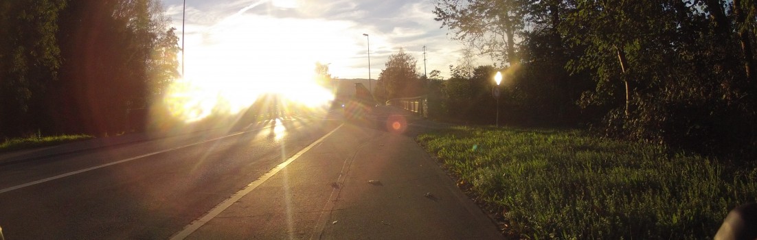 Am Abend, fast das gleiche Schauspiel, nur umgekehrt. Den letzten Sonnenstrahl erwischte die Kamera nach etwa einem Drittel der Strecke. Danach verschwand die Sonne hinter dem Heitersberg. Langsam kündigte die Dämmerung die heranbrechende Nacht an. Nach Baden noch einen letzten Blick auf die rot leuchtenden Ausläufer des Juras. Danach wurde es rasch dunkler. Es reichte gerade noch, die letzten Kilometer durchzuradeln, ohne den Scheinwerfer zu montieren.