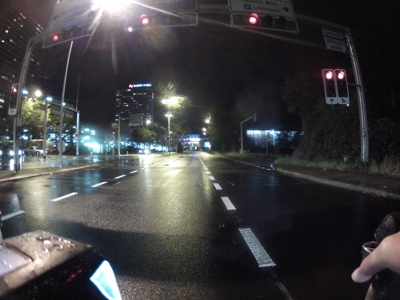 Laut Niederschlagsradar hätte es am Abend noch längst reichen müssen, vielleicht wieder auf nassen Strassen zwar, aber bei trockenem Himmel nach Hause zu fahren. Leider zerschlugen die kleinen Kreise auf dem Wasser des Tümpels im Innenhof unseres Bürogebäudes alle derartigen Hoffnungen.