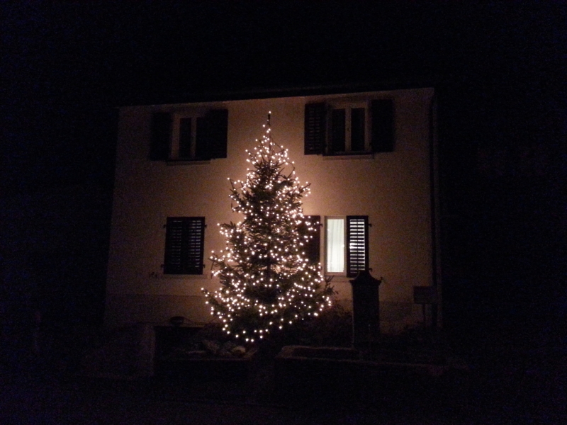 Der Weihnachtsbaum vom heutigen Foto gefällt mir immer wieder. Sein warmes Licht, das Haus dahinter, das diese Wärme aufzunehmen scheint, der Brunnen im Vordergrund. Alles passt irgendwie zusammen. Es fehlt nur noch der Schnee.