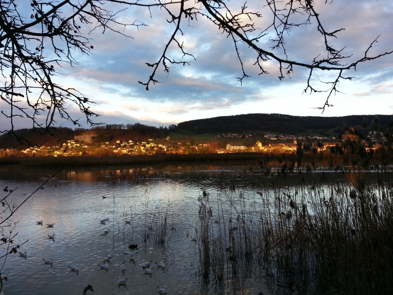 Fast zur Halbzeit unseres Marsches werden wir abermals von einer schönen Beleuchtung der Häuser von Klingnau überrascht. Anscheinend scheint die Sonne genau durch einen Spalt der Wolkendecke genau auf das Dorf. Die rötliche Abendsonne verleiht dem Anblick etwas zauberhaftes.