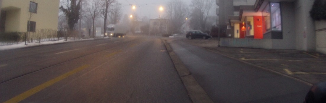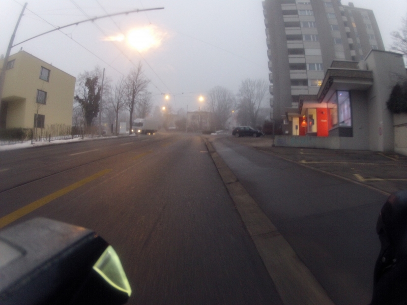 Vielleicht bin ich ja etwas ungeduldig. Aber die beiden Fahrten vom Anfang der Woche als im Limmattal noch der Mond über dem Heitersberg zu sehen war, sind bei all den Nebelfahrten der letzten Tage schon fast in Vergessenheit geraten. Denn auch heute lag nochmals Nebel. Zusammen mit der Kälte gefror heute sogar die Feuchtigkeit auf den Brillengläsern wieder an. Zweimal musste ich anhalten, Handschuhe ausziehen, die Brille mit den kalten Händen doch noch etwas aufwärmen, damit ich dann das aufgetaute Eis abwischen konnte.