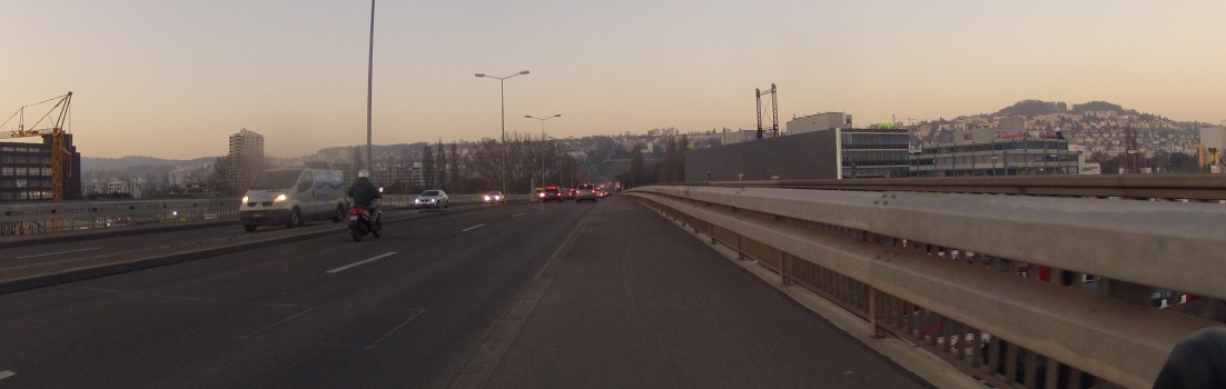 Ich mache heute etwas früher Schluss. Will noch bei Tageslicht wenigstens an die Stadtgrenze kommen. Für ein Foto mit, oder in meinem Falle gegen die Sonne und den Sonnenuntergang, hat es aber nicht gereicht. Immerhin aber für eine leichte Rötung am Horizont und für ein paar Aufnahmen, ohne leuchtenden Scheinwerfer am Lenker und ohne Strassenbeleuchtung.