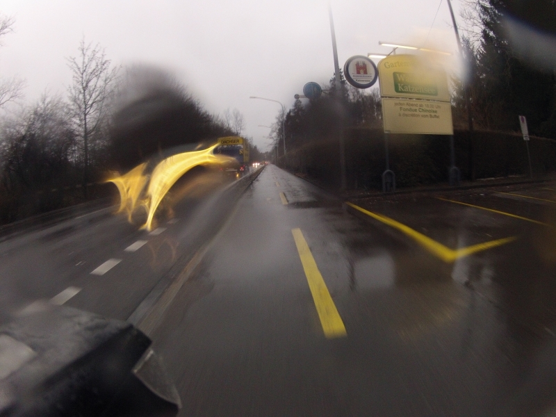 Was dann folgte war eine Fahrt im Schneeregen durch das Furttal. Die Fotos von der Kamera am Lenker, geschossen während der morgendlichen Fahrt zur Arbeit, sind nicht zu gebrauchen. Sehr rasch verklebte die Linse mit den Schneeflocken und wurde “blind”. Die Strassenverhältnisse waren für Regen normal. Wasser halt, aber wenigstens kein Eis oder auch nur Schneematsch. Das Rennrad hätte diese Aufgabe längstens auch meistern können.