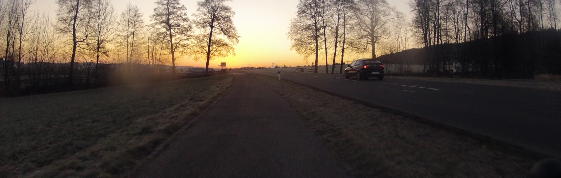 Bei der morgendlichen Fahrt durch das Furttal, etwa ab der zweiten Hälfte, schoss meine Kamera am Lenker gleich reihenweise recht gute Fotos vom Sonnenaufgang. Die Voraussetzungen waren gut. Klarer Himmel, nicht eine einzige Wolke. Nur den Bodenfrost, den hat die Kamera übersehen.