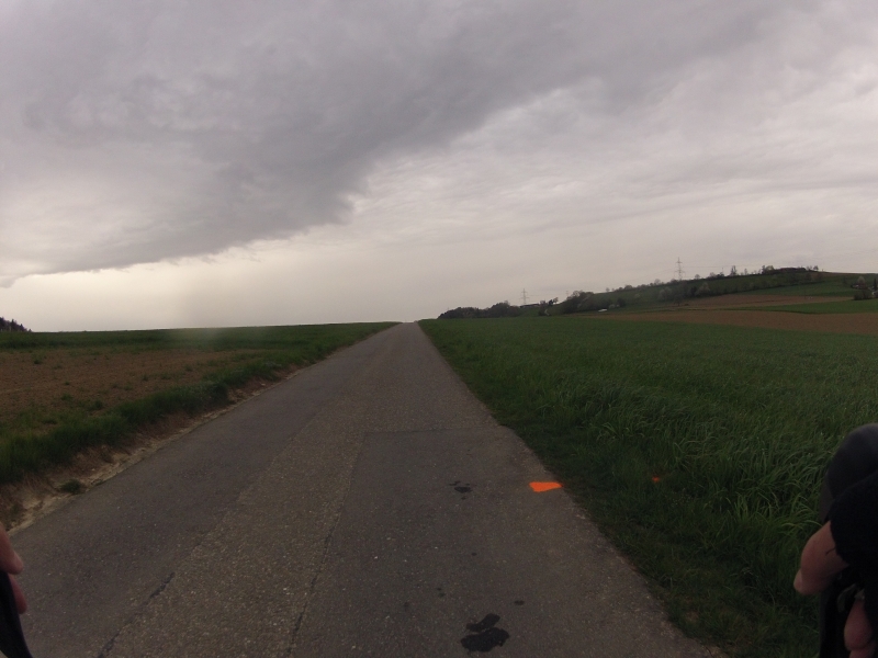 Wohl wegen der angesagten Niederschläge blies heute Abend während der Heimfahrt ein kräftiger Wind. Er schob die ersten Nieselregen vor sich her. Noch nichts, weshalb ich den Regenschutz hervorgekramt hätte. Doch ich war dann doch froh, dass ich heute nur noch eine kleinere Zusatzrunde zu fahren hatte und trotzdem noch trocken nach Hause kam. Es sah ganz so aus, als ob es hufeisenförmig um mich herum bereits regnen würde.