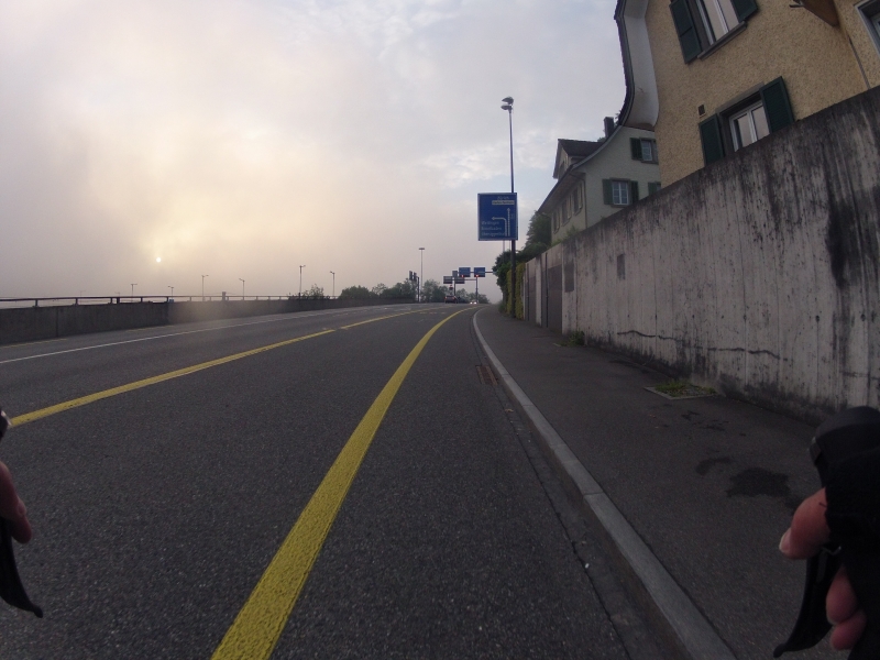 Und dann am Abend. Auf dem Radweg ausgangs Endingen. Eine jener schönen Bodenwellen. Hat man genügend Schwung, reicht es bis fast auf die nächste Welle hinauf. Am untersten Punkt aber eine nicht ganz übersichtliche Kurve. Bremsbereitschaft ist das Mindeste auf jeden Fall. Ich komme um die Ecke, steht da eine Mutter mit Kleinkind und manövriert irgendwas mit dem Kinderwagen auf dem Weg herum. Sie ist wahrscheinlich mehr erschrocken als ich, ruft ihr Kind zu sich und mir hinten nach “Ha dänn no en Hund”. Doch wo? Die nächsten 100 Meter sind frei auf der Strasse.
