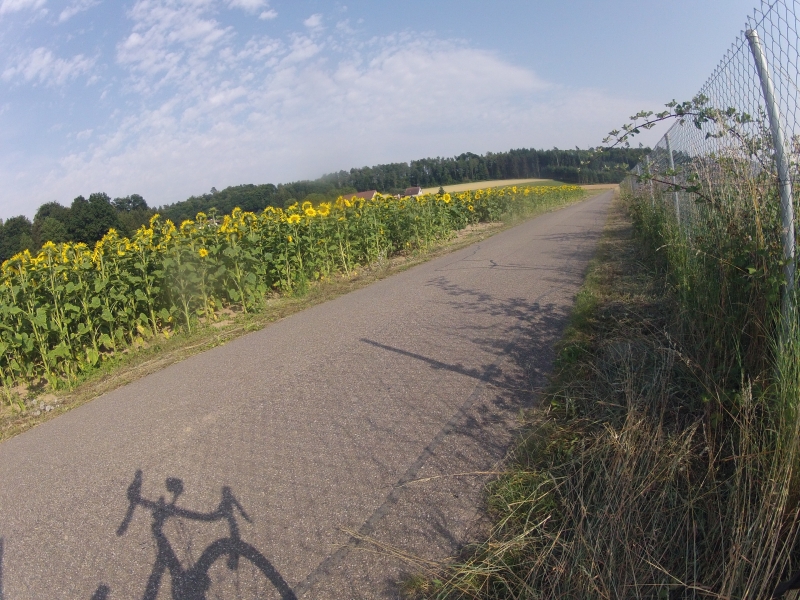 Sowohl im Furttal am Morgen wie auch im Surbtal am Abend fahre ich an einigen Feldern mit gepflanzten Sonnenblumen vorbei. Sie wachsen in der Regel sehr schnell in die Höhe. Sie sind aber in ihrem Wachstum auch sehr unterschiedlich weit. Während ich bis jetzt nur Felder gesehen habe, deren Stengel höchstens bis auf Lenkerhöhe gewachsen sind, war ich heute sehr überrascht, auf dem Heimweg, auf dem untersten Stück im Aaretal bereits ein Feld von Sonnenblumen in voller Blüte zu sehen.