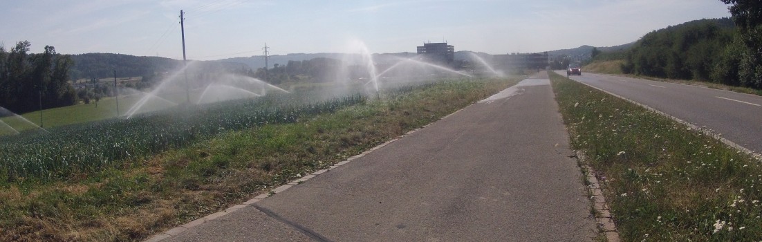Bereits am Morgen früh werden im Furttal bei solchen Verhältnissen die Salat- und Gemüsefelder schon kräftig bewässert. Vermutlich wird man den ganzen Tag an irgend einer Stelle eine laufende Bewässerungsanlage finden.
