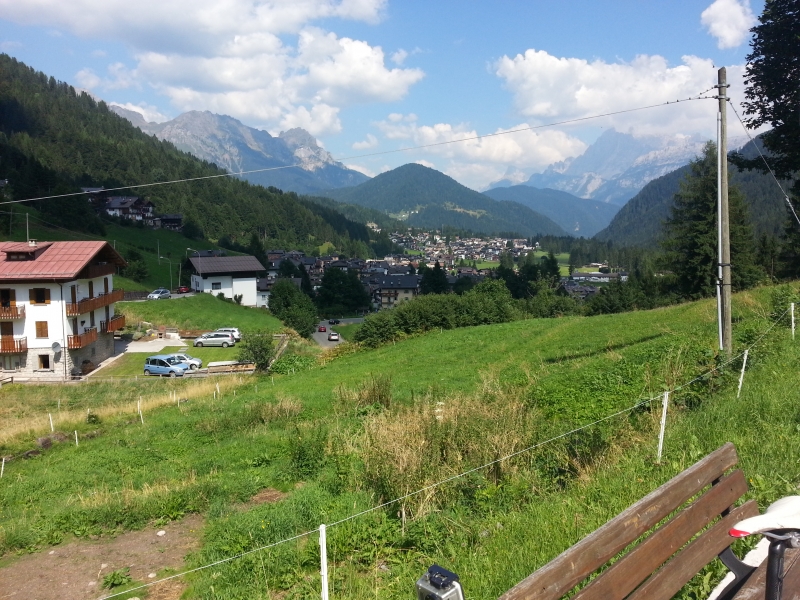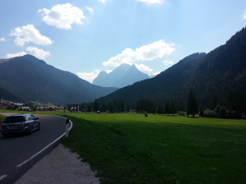 Meine Fahrt führte mich heute wieder nach Moena und weiter nach Pozza di Fassa, dort wo ich gestern vom Karerpass heruntergefahren kam. Nur, heute war Montag und da war auf den Strassen wirklich viel los. Kilometerlange staus in Richtung Passo Fedaia. Mit der Zeit löste sich die Kolonne auf, die Touris verschwanden in den vielen kleinen Dörfchen. Recht hatten sie. Die Region scheint ein richtiges Touristenparadies zu sein. Schöne Häuser, schöne Hotels, viel Gastronomie direkt an der Strasse. Soweit ich während der Durchfahrt in die Dörfer hineinblicken konnte, schienen dort auch Fussgängerzonen vorhanden zu sein. Im Tal, entlang des Baches wurde flaniert und gewandert oder schon der Picknick-Korb ausgebreitet. Auch landschaftlich ist es ein sehr schönes Tal, hier mitten durch die Türme der Dolomiten.