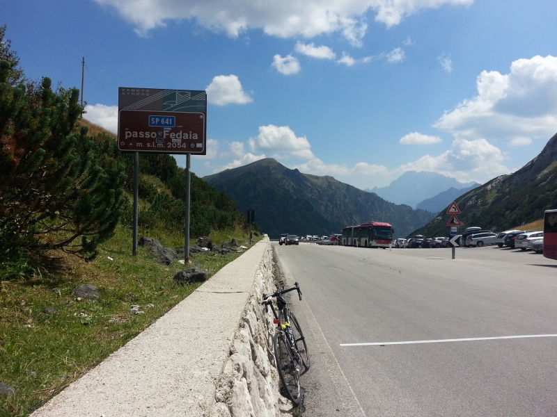 Die ersten zehn Kilometer der Abfahrt hinunter nach Alleghe sind unheimlich steil. Da liegen problemlos 15 und mehr % Gefälle drin, über mehrere Kilometer, ohne Unterbruch. Bergwärtsfahrende Rennradler hatten echt Mühe. Einige schoben, andere standen am Strassenrand und schütteten sich Wasser über den Kopf.