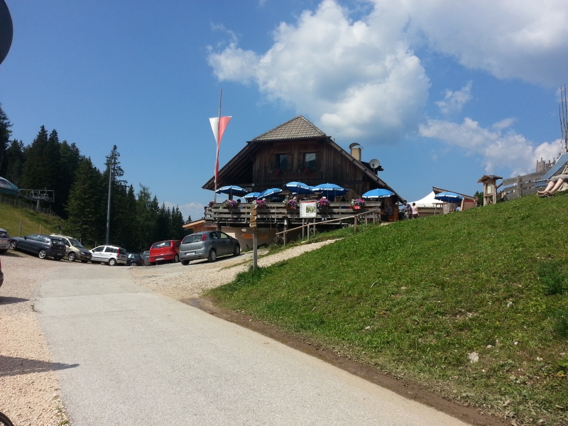 Als ich auf der Oberregger Alm ankam, wurde mir plötzlich vieles klarer. Meine heutige Strecke führt fast ausschliesslich durch Skigebiete. Bereits auf dem Passo Lavaze, sicher im Jochgrimm und nun auch in Obereggen und der Oberegger Alm, muss im Winter Hochbetrieb herrschen. Beschneiungskanonen an jeder Ecke, Skilifte, Gondelbahnen, Wasserreservoirs, Beleuchtungseinrichtungen für Nachtskifahren, Einrichtungen für Fangnetze, nebst der ganzen Gastronomie. Alles ist da. Meine geteerte Strasse dürfte wohl über weite Strecken der Schlittelweg sein. Die ganzen Kilometer von der Oberegger Alm bis hinüber zum Passo Pampeago dürften ein einziger Tummelplatz für die Freunde des Skisports sein.