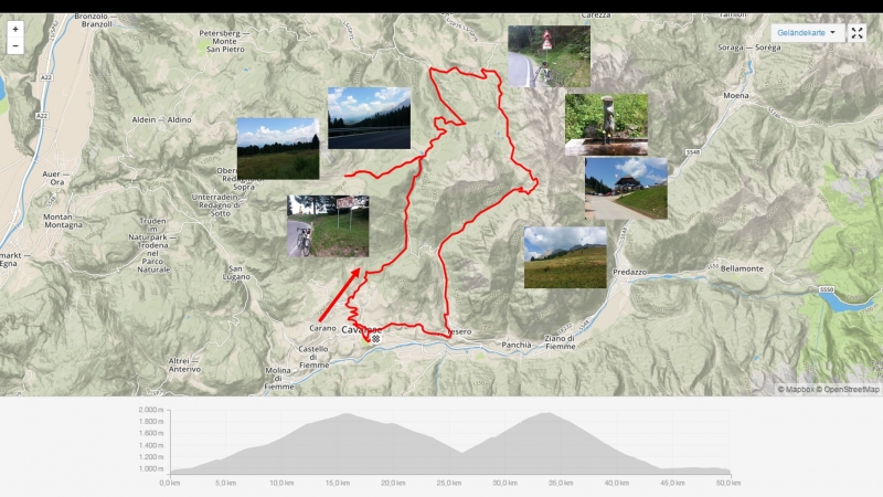 Es war wieder eine jener Strecken, die praktisch vom Hotel weg in die Höhenmeter ging. Langsam gewöhne ich mich vielleicht daran, dass es in den Dolomiten gegen den Schluss immer steiler wird. So auch heute. Während der Auffahrt auf den Passo Lavaze, sieht man wegen des Waldes eigentlich nichts. Man fährt durch das Tal nach hinten und ist irgendwann mal oben.