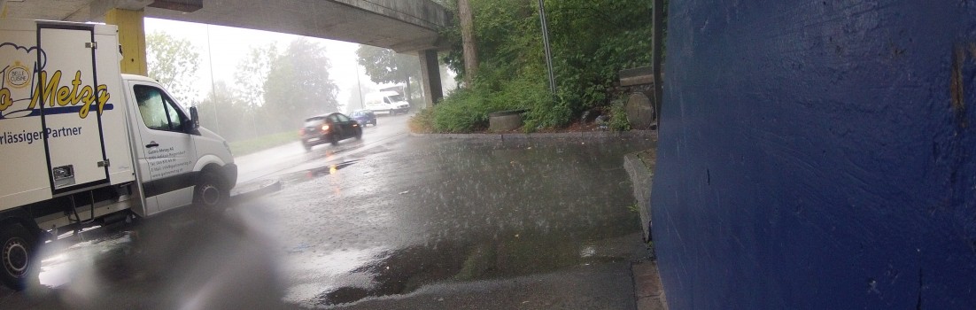 Doch spätestens bei der Abzweigung ins Furttal oder doch lieber das Surbtal, war es klar. Klar wie der dunkelste Himmel. Es wird nichts mit trockenem Himmel. Es reichte gerade noch, um unter das Vordach bei der Verladerampe des Grossverteilers zu hetzen. Dann ertrank der Traum von der trockenen Heimfahrt auf nassen Strassen – im Gewitterregen.