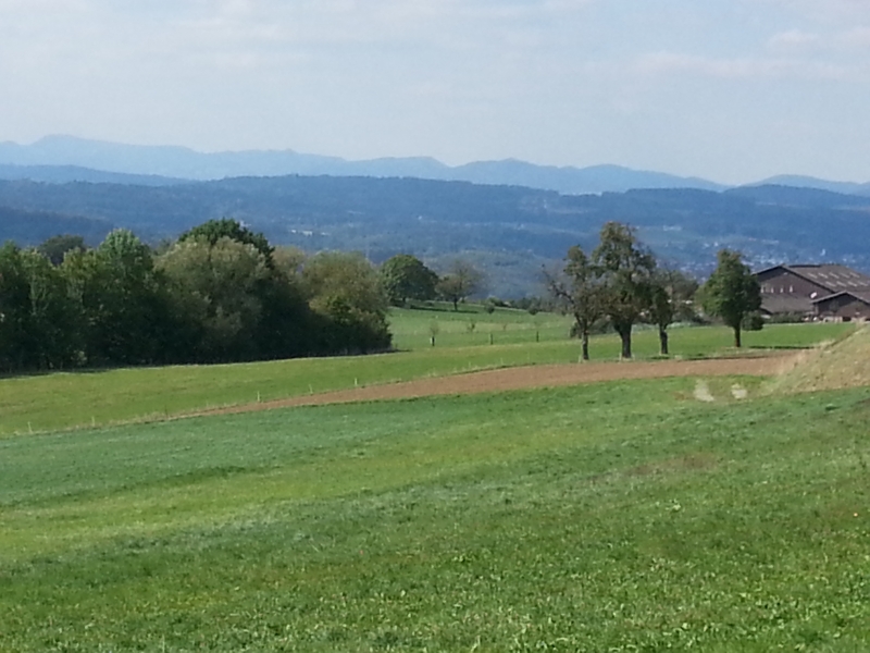 Zwischendurch immer wieder schöne Ausblicke ins Reusstal, später dann ins Bünztal und an die Hügel links und rechts. Ich wusste nicht recht, wonach ich für eine Fotographie suchen wollte. Einerseits war es weit und breit recht dunstig. Die grünen Hügel lassen den Herbst noch nicht richtig erkennen und Sommer ist es ja auch nicht mehr so richtig. Dürre, braune Mais- und Sonnenblumenfelder wollte ich auch nicht im Vordergrund haben. Eine Herde Pferde vor einem Industriegebäude war mir zuwenig. Den Blick vom Wehr bei Villnachern auf die Aare durch den Wald? Verpasst, noch ganz grün, das Bild könnte vom Sommer sein.