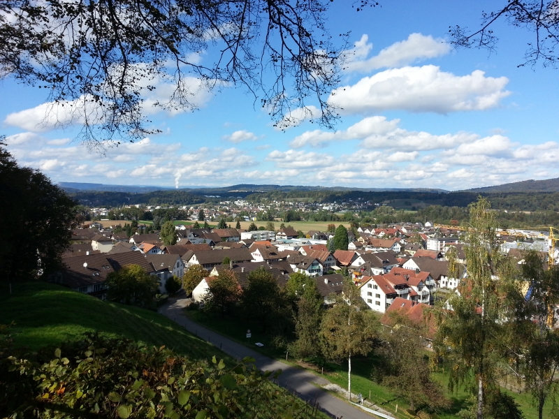 Nach Mellingen entdeckte ich den Wegweiser nach Hägglingen. Das könnte es doch sein, bereits hier ins Bünztal hinüber zu wechseln. Die Strasse führte nach Tägerig. Es wurde steiler und steiler, hatte sogar zwei Spitzkehren drin. In der zweiten Spitzkehre hielt ich kurz für ein Foto an. Tägerig im Vordergrund, danach Mellingen und weit hinten die Dampffahne des AKW in Leibstadt am Rhein. Dazwischen das Birrfeld und der unterste Teil der Aare. Die Fernsicht schien heute recht gut zu sein.