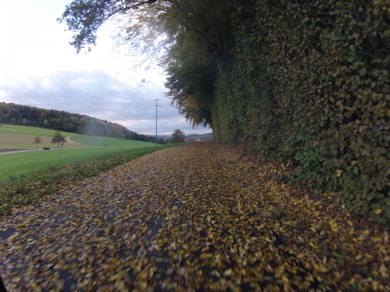 So bin ich denn heute Abend zum ersten Mal in diesem Herbst über einen geschlossenen farbenen Laubblätter-Teppich gefahren. Es war auf einer Waldstrasse, etwas abseits, ohne viel Verkehr.
