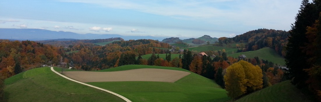 Wenig später wechselte die Strasse auf die andere Seite des Hügels und man hatte einen wunderschönen Ausblick auf den Jura im Hintergrund und auf die farbigen Wälder im Vordergrund.