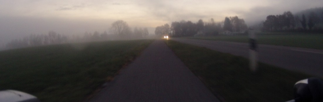 Dickster Nebel auf der Strasse, teilweise auch feuchte Strassen. Sicht in der Nähe von Null. Doch nach wenigen Kilometern begann sich die Sauce aufzulösen, die Helligkeit des beginnenden Tages wurde sichtbar. Nochmals ein paar Kilometer weiter nach dem heutigen Foto, fuhr ich unter einem klaren Himmel nach Zürich. Doch es muss auch dieser Moment gewesen sein, an dem die Temperatur auf dem tiefsten Punkt angekommen war. 0 Grad bei einer so hohen Luftfeuchtigkeit fühlen sich schon noch furchtbar kalt an.