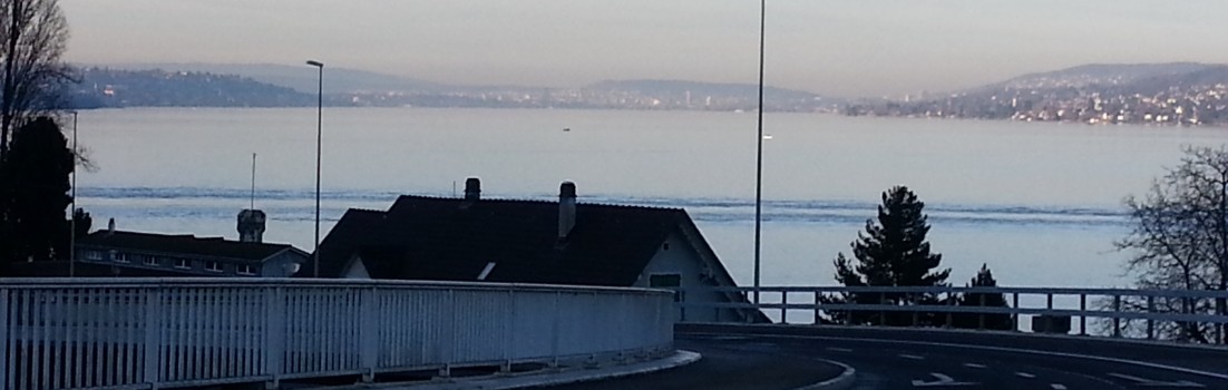 Die 58 Kilometer ab dem Glarnerland bis nach Zürich beginnen sich in die Länge zu ziehen. Teilweise ist es recht kalt. Manchmal liegt auch jetzt am Abend noch (oder schon wieder?) Frost auf dem Radstreifen. Doch ich erreiche Zürich noch so, dass es noch für ein letztes Foto über den See reicht.