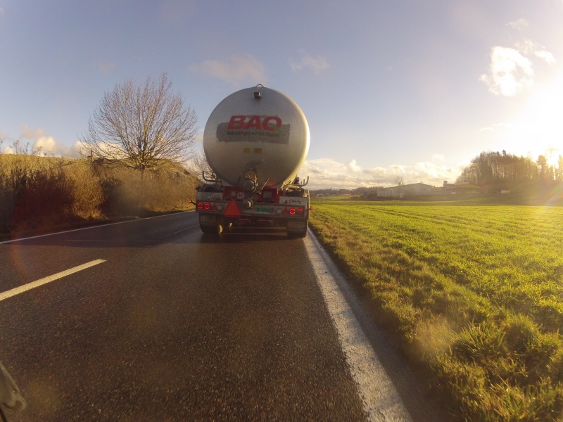 Die Strassen waren zwar grösstenteils recht nass. Das Sonnenlicht, als Gegenlicht, blendete manchmal schon fast schmerzhaft in den Augen, trotz aufgesetzter Sportbrille. Dazu kamen teils heftige Windstösse, je nach Fahrtrichtung, oft auch als Seitenwind. So war ich dann gar nicht enttäuscht, dass mir ein Traktor mit riesigem Anhänger etwas Windschatten spendete. So kam ich ein gutes Stück recht zügig durch das Reusstal hinauf.