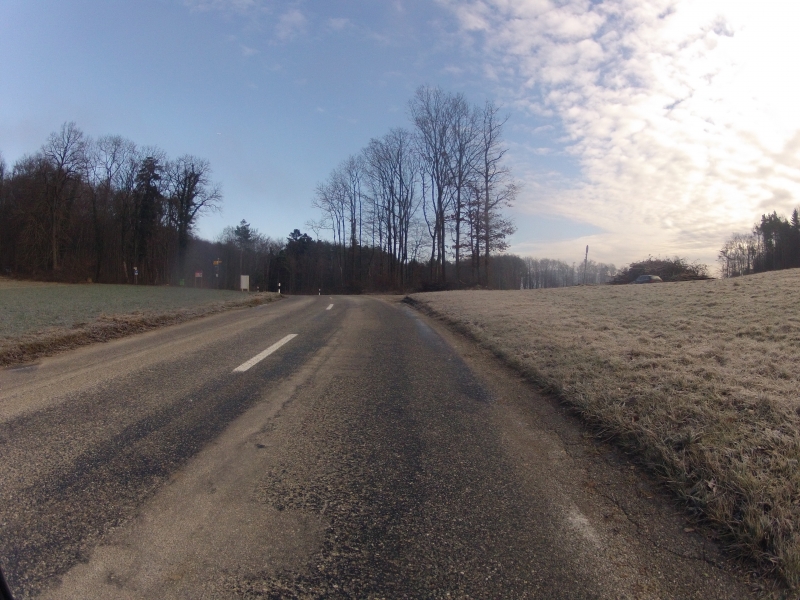 Die Strassen waren wieder trocken. Ein paar Wasserlachen gefroren, die Wetterfront im Anzug. Noch hatten wir Nebel, aber es müsste für eine Runde reichen.