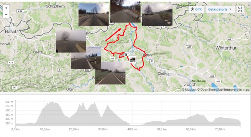 Nach dem Rotberg geht es das letzte Mal längere Zeit für heute hinunter. Bei der anschliessenden Kurblerei durch das Aaretal hinauf, steigt auch die Wärme wieder langsam in mir auf. Noch ist das Wetter trocken. Ich entschliesse mich für eine Zusatzschlaufe über Baden und anschliessend hinunter nach Mellingen. Beim Überqueren der Reuss fallen die ersten Graupelkörnchen vom Himmel.