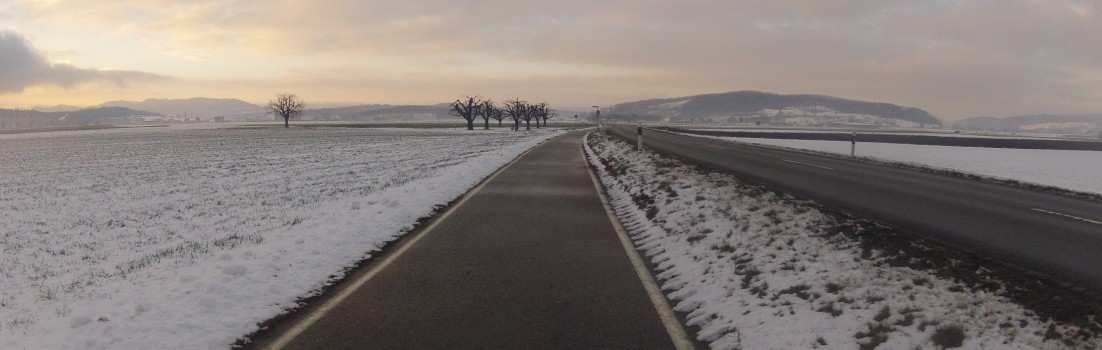 So bog ich dann in Brunegg links weg, unter der Autobahn hindurch, alles über Feldwege. Geteerte und ungeteerte. Am Boden breitete sich ganz langsam ein feiner Nebelschleier aus. Wie man auf dem Track sehen kann, fuhr ich genau deshalb eine kleine Runde, nur um der Kamera am Lenker die Chance für ein paar gute Aufnahmen zu geben. Doch daraus wurde dann doch nichts. Die Schleier waren noch zu wenig dicht, das Licht gab zu wenig Kontrast her.