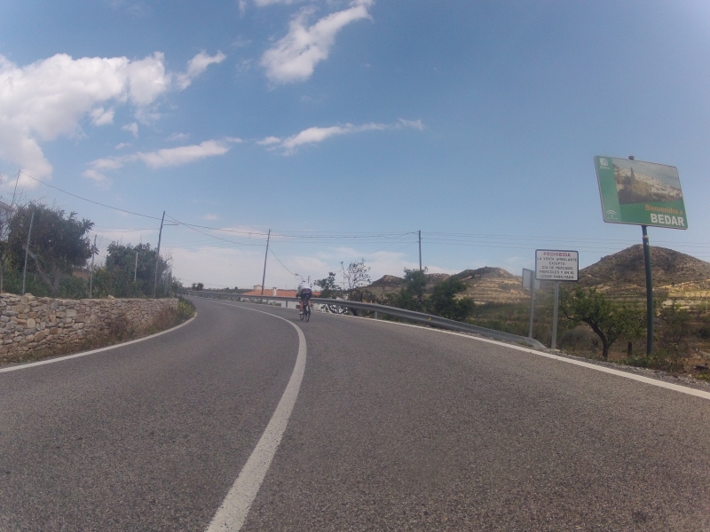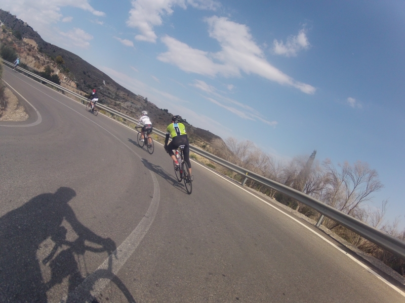 Eine unserer Touren hatten wir für heute umgekehrt. Wir fuhren dem Meer entlang über das Carboneras-Pässli bis hinunter nach Agua Amarga, dem griechisch anmutenden, kleinen Dörfchen am Meer. Ab dann ging es ins Landesinnere. Zuerst im Gegenwind über die Ebene, doch anschliessend half uns ein sanfter Rückenwind dem Rio Aguas entlang hinauf bis nach Sorbas, wo wir heute den Mittagslunch erhielten.