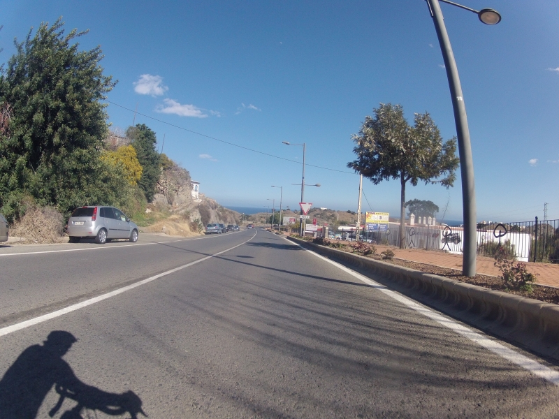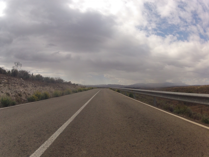 Als wir von der Anhöhe über Cariatiz nach Sorbas hinunterfuhren, konnten wir zuschauen, wie sich die Regenwolke vor uns über die Hügel drückte. Es dauerte eine Weile bis wir einigermassen sicher waren, dass sie sich nach Westen verschob. Zwar mit unserer Fahrtrichtung aber vielleicht doch noch vor uns.