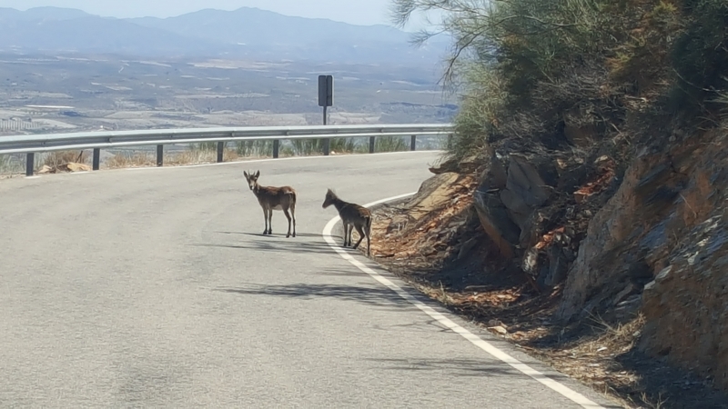 In der Abfahrt hinunter nach Uleila del Campo, kämpfe ich gegen die Böen des Windes. Ich komme gerade aus einer windgeschützten Ecke hervor, als sich im Schatten etwas bewegt. Zwei Gemsen stehen da, und bewegen sich gerade hinaus auf die Strasse. Nur kein Lärm machen jetzt. Schade läuft meine Kamera am Lenker nicht. Die Gemsen sehen mich, bleiben auf der Strasse stehen. Ich kann sogar den Fotoapparat aus dem Klettverschluss herausnehmen. Alles schön langsam, ja keine Aufregung. Noch stehen sie auf der Strasse.