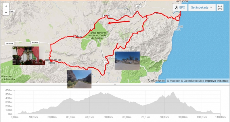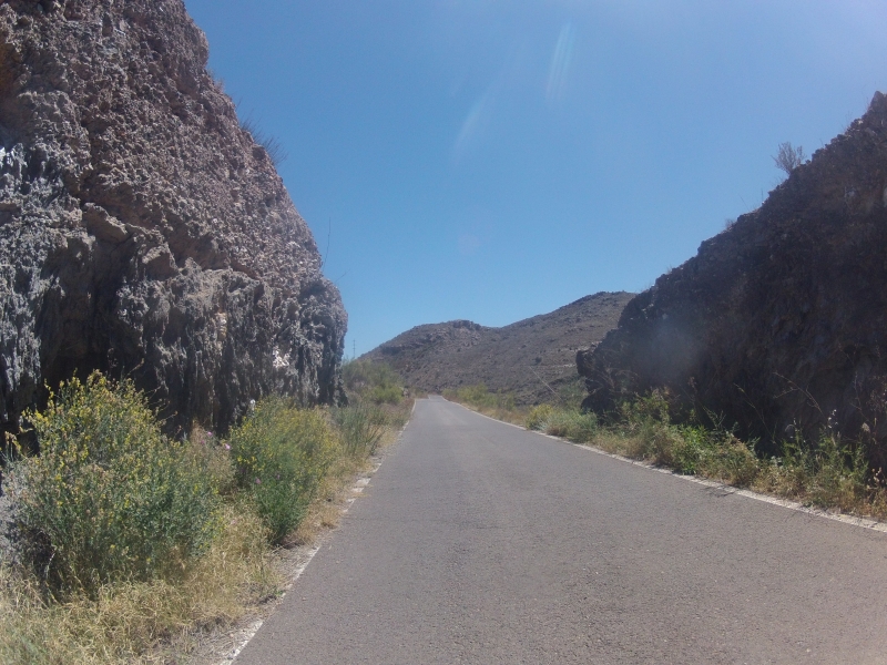 Nach einer kurzen Fahrt bergauf gelangten wir schon bald an den Fuss der Sierra Cabrera. Die steile Auffahrt fühlte sich wegen des Gegenwindes heute noch etwas steiler an. Dafür hatten wir bei diesem wunderbaren, wolkenlosen Himmel auch eine sehr gute Sicht. Wir konnten wieder einmal bis hinüber in die noch schneebedeckte Sierra Nevada schauen.