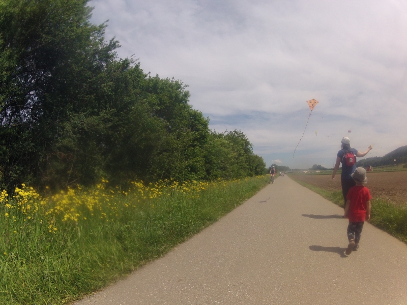 Nach Baldingen geht es wieder hinunter nach Endingen ins Surbtales. Dann weiter, langsam ansteigend an den Fuss des Regensberges. Ein Kaffee an der Strecke, welches ich noch von meinen Arbeitswegen kannte, hatte heute geschlossen. Im Surbtal fand irgend eine Show mit Drachen statt. Ich gönnte mir einen kurzen Halt um dem Geschehen zuzuschauen.