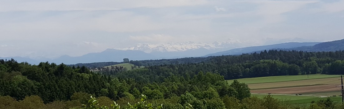 Auf der Anhöhe über Birmenstorf, mache ich beim Anblick des Alpenkammes nochmals eine Pause. Vielleicht war es ja wirklich die fehlende Cola oder der Kaffee, der mich heute etwas aus dem Gleichgewicht geworfen habe. Wahrscheinlicher aber dürfte sein, dass ich wieder einmal zu wenig Flüssigkeit zu mir genommen habe. Sonne, Wärme und der aufkommende Wind haben dann ebenfalls noch das ihrige zu meinem Austrocknen beigetragen. Höchstwahrscheinlich habe ich mich bereits am Bözberg und später bei der Auffahrt nach Kaisten zu stark verausgabt.