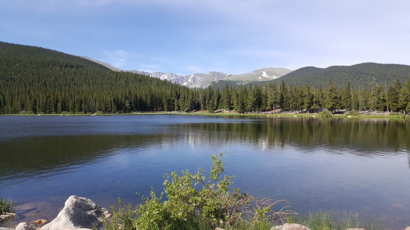 Wir fahren ab Idaho Springs durch kühle Täler und Wälder, bei angenehmen Steigungen, meist unter fünf Prozent, hinauf. Nach etwa 11 Kilometern und bereits 850 Höhenmetern erreichen wir den Echo Lake. Eine wunderbare Sicht öffnet sich uns, nach dem wir bis jetzt fast nur zwischen hohen Tannen und Laubbäumen in die Höhe gefahren sind.