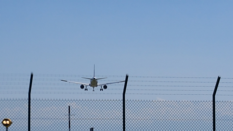 Einen späteren Versuch, noch näher, beziehungsweise direkt unter der Anflugschneise, ein kleines Filmchen zu drehen, wie der Flieger über meinem Kopf zur Landebahn schwebt, musste ich wegen der Hitze aufgeben. Garmin zeigte mittlerweile 40 Grad an, selbst die metallenen Teile an meinem Handy fühlten sich brandheiss an. So blieb es halt bei einer statischen Aufnahme von hinten.