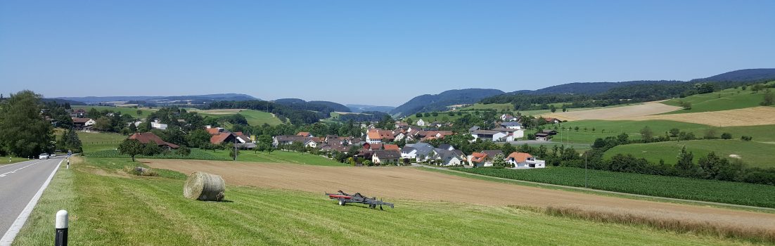 Links im Bild, etwa auf der Höhe des markten Daches, befindet sich die eigentliche Passhöhe der Staffelegg. Ab da ging es in Richtung Fricktal zügig hinunter. Als Zwischensteigung nahm ich heute noch den kurzen Aufstieg nach Zeihen, bevor es anschliessend weiter in die Höhe auf den Bözberg ging.