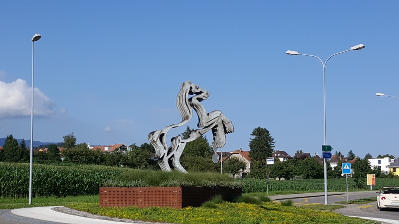 Es passiert mir immer wieder, wenn ich entlang der violetten Linie auf dem GPS fahre, vergesse ich zu fotographieren. Erst jetzt wieder bei diesem Strassenkreisel greife ich zum Fotoapparat. Die Pferde fallen mir deshalb auf, weil hier “nur” eine Mercedes Vertretung steht. Erwartet hätte ich ja eigentlich etwas von Ferrari.