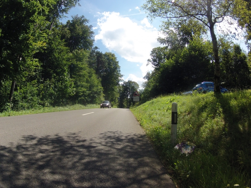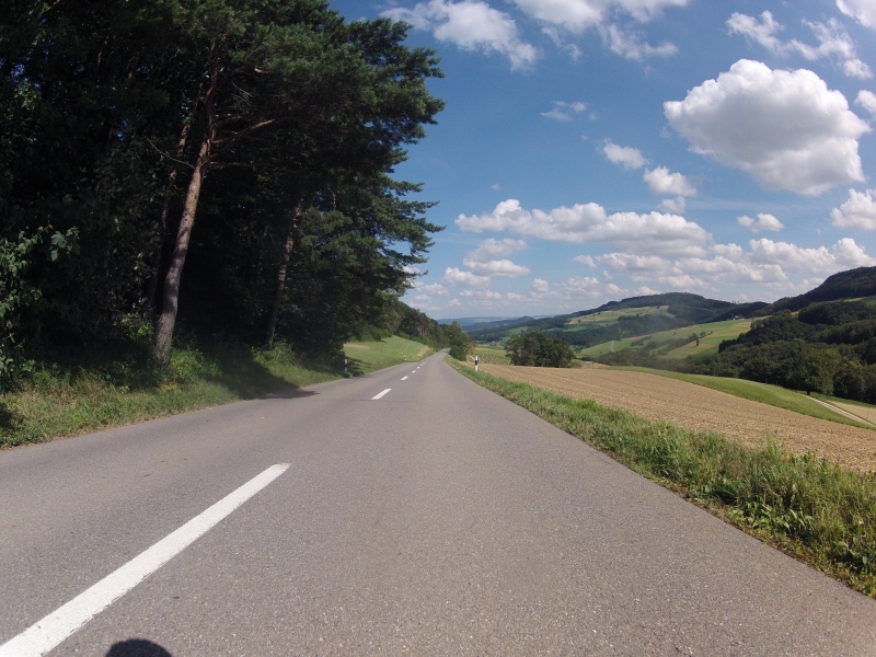 Vom Bözberg hinunter ins Fricktal bis nach Frick. Diesmal nochmals die gleiche Abzweigung in Richtung Sissach. Aber da ich nicht schon wieder über die Saalhöhe fahren wollte, bog ich eine Abzweigung früher nach Wölflinswil ab und gelangte so auf das Benkerjoch. Die Passstrasse wurde hier in den letzten Jahren sehr schön gemacht. Breit, lang gezogene Kurven, übersichtliche Streckenführung. Es rollt mir gut und so komme ich bald auf der Passhöhe an.