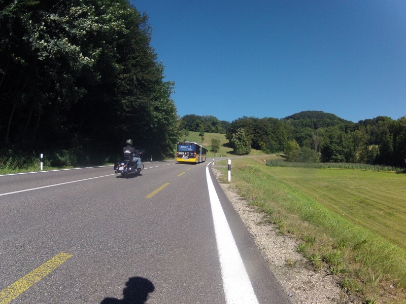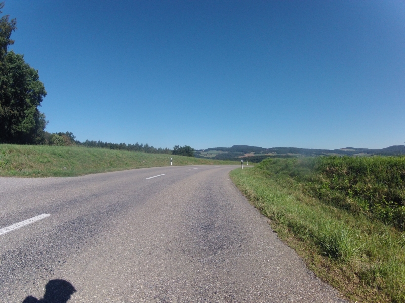 50 KM für eine Rundfahrt an einem so schönen Sommertag sollten schon zusammenkommen. So biege ich auf der Passhöhe nach links weg. Überquere den Bözberg auf welligem Gelände bevor es zum Schluss eine steile Rampe durch den Wald hinunter ins Villigerfeld geht. Ich behalte den Schwung bei und umrunde das Villigerfeld, bevor ich die kurze Schussabfahrt hinunter ins Aaretal nehme.