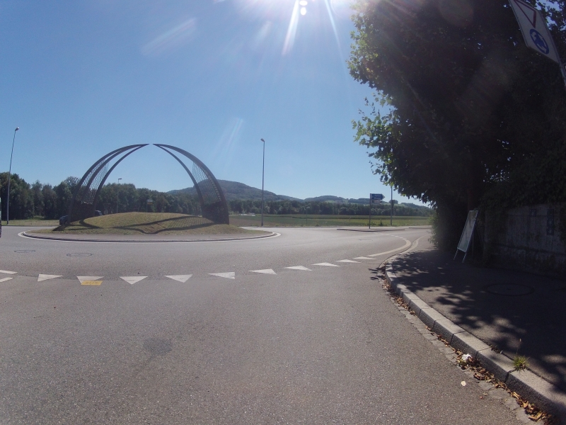 In Blickrichtung geradeaus befindet sich das Wasserschloss, der Zusammenfluss von Reuss und Limmat in die Aare. Die Figur auf dem Kreisel im Vordergrund soll das irgendwie darstellen. Dem Vernehmen nach, sollen die Steinbrocken in den Gitterkörben der Figur aus dem Bachbett dieses Wasserschlosses stammen.