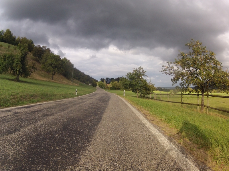 Meine Fahrt ging dann weiter. An den sichtbaren Hügeln entlang, quasi vom linken Bildrand bis in die Mitte des Bildes. Die Wolken hellten auf diesen letzten Kilometern immer mehr auf. Die Sonne begann sich immer häufiger durchzusetzen.