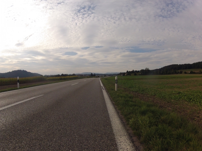Die erste Fahrt im Herbst. Nicht richtig sonnig, aber auch nicht viel Wolken. Irgendwie diffuses Licht, kaum Fernsicht. Temperaturen, naja, es war auch schon wärmer. Ich zog es jedenfalls vor, in 3/4-lang und mit Windschutz zu fahren, zumal ich nicht die Absicht hatte, grössere oder längere Rampen hinauf zu kurbeln.