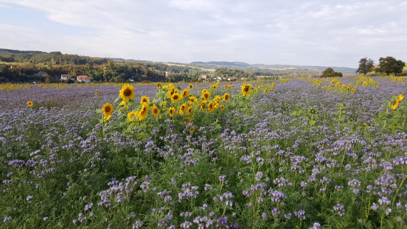 Ein merkwürdiges Blumenfeld stand hier an meinem Weg über die Bürensteig. Eigentlich ein Feld voller violetter Blumen, wohl aus der diesjährigen Saat. Dazwischen einige Sonnenblumen in voller Blüte. Absichtlich zu den violetten Blumen gemischt, oder Überbleibsel vom Sonnenblumenfeld aus dem letzten Jahr? Merkwürdig deshalb, weil alle anderen Sonnenblumenfelder zur Zeit schon fast vollständig verdorrt und vertrocknet in der Gegend herumstehen.