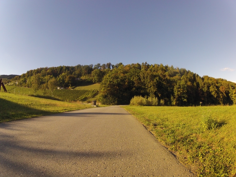 Kurz nach dem die Strasse im Wald verschwindet wird sie deutlich steiler. Nach der Bahnlinie, etwa auf der Höhe des Rebberges, sichtbar in der linken Bildhälfte, ist sie zudem auch nicht mehr geteert, bis auf die letzten paar hundert Meter vor dem höchsten Punkt auf dem Bözberg. Zudem kratzt das Gefälle ein paar Mal an der 20%-Grenze. Doch dank der trockenen Verhältnisse und nicht allzu viel Kies auf der Strasse, bot sie heute keine zusätzlichen Probleme.