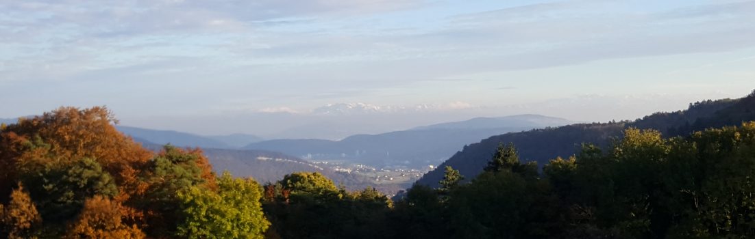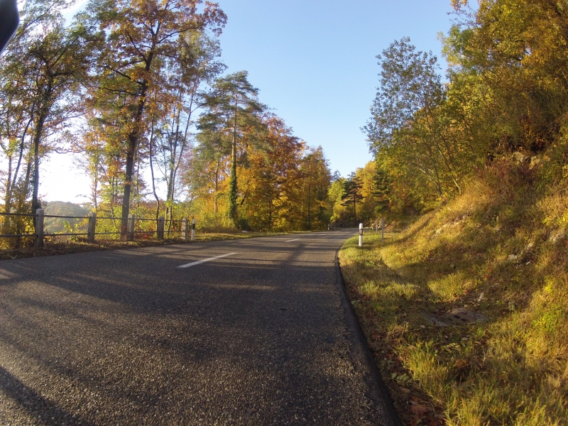 Schon bei der ersten Erhöhung, den Hügel von Rein, glaubte ich, dass man vielleicht die Berge in der Ferne sehen könnte. So entschloss ich mich als erstes auf den Rotberg hinauf zu kurbeln. Das Villigerfeld lag noch in der Abendsonne. Die Wälder am Rotberg leuchteten in den schönsten Farben. Mindestens der zweite Teil der Auffahrt war farblich gesehen ein Feuerwerk.