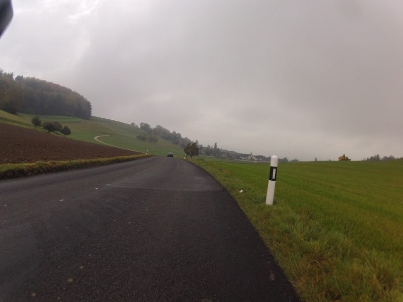 Dem Hallwilersee entlang waren die Strassen grössstenteils tatsächlich trocken. Ab und zu sah man an die Hügel links und rechst. Wolken und Nebel hingen hoch über den Hügeln.