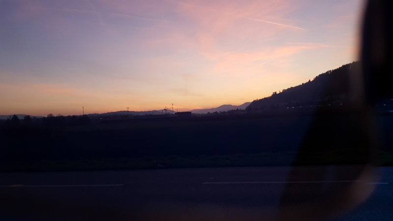 Anfänglich nur dunkler Wald und schwarze Strasse um mich herum. Doch fast zu oberst verlässt die Strasse den Wald und führt auf das offene Feld hinaus. Immer noch bergauf. Da war die Nacht dann doch nicht mehr so ganz schwarz wie im Wald, dunkelblau vielleicht, ein letzter rosa Streifen am Horizont und knapp darüber die schmale Sichel des Mondes.