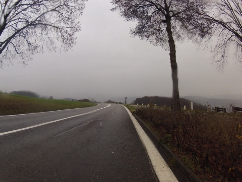 Nach dem zweiten Buckel in Richtung Elfingen und Bözen setzte der Regen wieder ein. Ich schlüpfte wieder in die Regenklamotten und machte mich im strömenden Regen an die Auffahrt zum Bözberg hinauf. Meine Hoffnung, dass es vielleicht im Aaretal doch nicht regnen würde, zerschlug sich aber auf der Passhöhe.