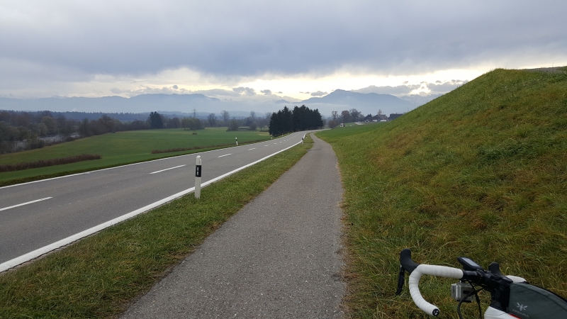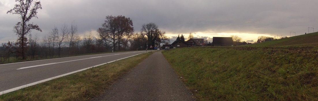 Früher, auf dem Arbeitsweg, kam es ja ab und zu vor, dass ich den Weg hin oder vor allem zurück, irgendwie “Gedanken verloren” gefahren bin. Ich kam an, der Kopf war aber die ganze Zeit mit etwas anderem beschäftigt. Ich denke, das ist mir nun heute auch auf einer längeren Fahrt, vielleicht zum ersten Mal, passiert. Klar habe ich vorweg überlegt, wo ich noch einen Radweg kenne, um dem üblichen Werkverkehr ausweichen zu können. Ich habe mich auch darauf konzentriert an einem günstigen Ort, mit schönem Blick zum Alpenkamm, ein Foto zu schiessen.
